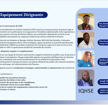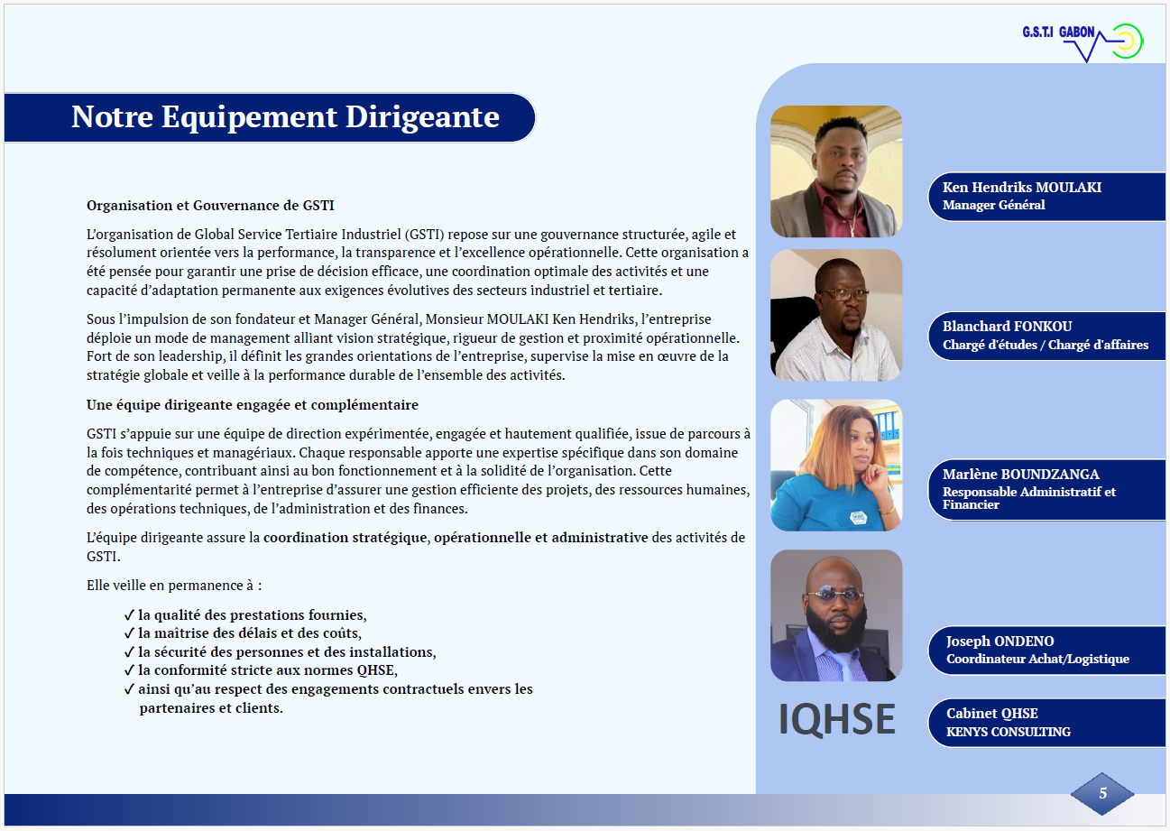 Global Service Tertiaire Industriel (GSTI) est une entreprise locale crée en 2021 par M. MOULAKI Ken Hendriks, qui se spécialise dans les services industriels et tertiaires tels que l'électricité, l'instrumentation de climatisation, la protection cathodique et les énergies renouvelables, Télécommunication. Basée à Port-Gentil au GABON, son siège se situe à la Cité Rose.